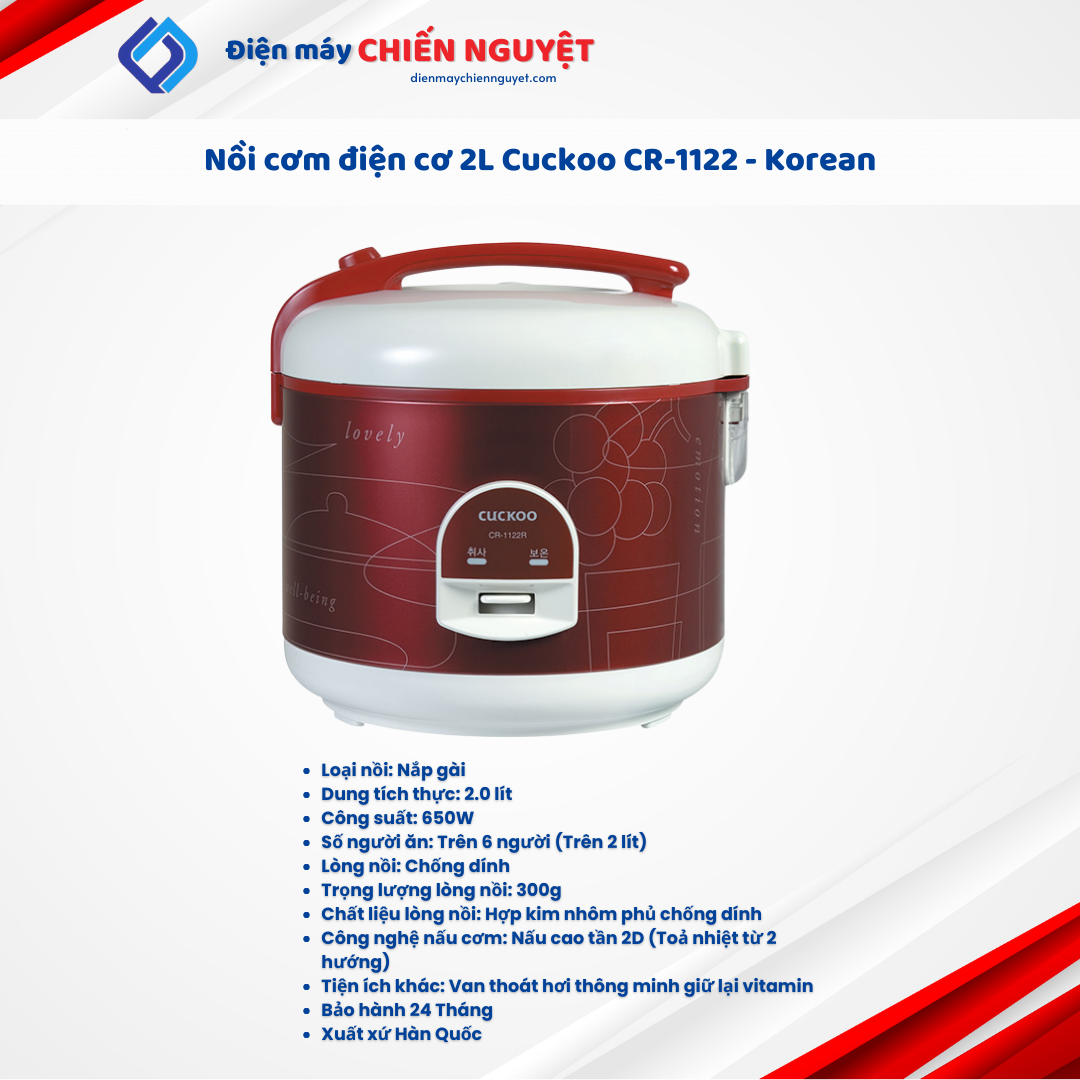Nồi cơm điện Cuckoo 2 lít CR-1122 thiết kế đẹp mắt, nấu ngon, dễ sử dụng, thích hợp cho mọi gia đình hiện đại.