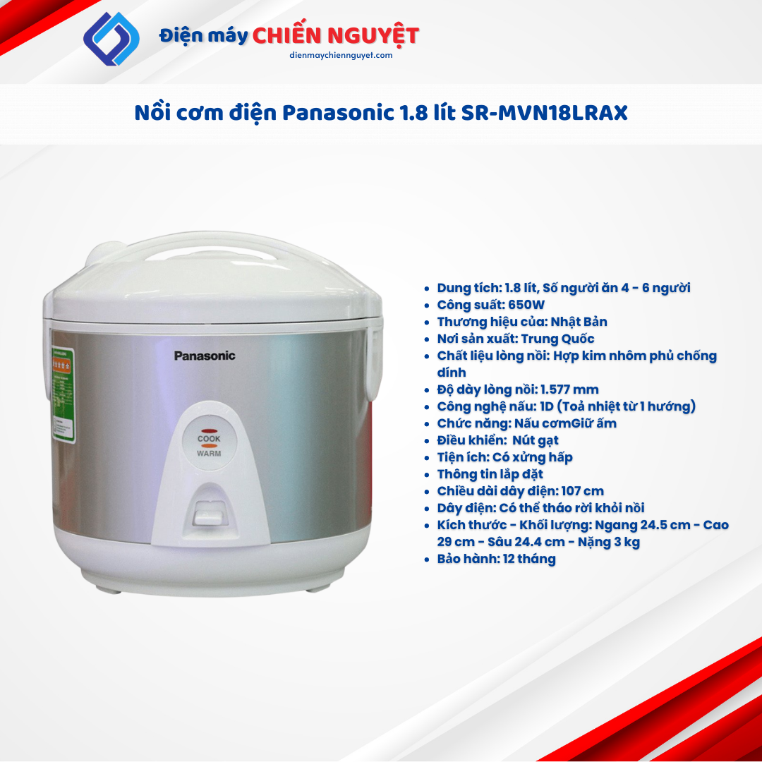Nồi cơm nắp gài 1.8 lít Panasonic SR-MVN18LRAX thiết kế đơn giản dễ sử dụng, đến từ thương hiệu uy tín Panasonic, là thiết bị gia dụng hữu ích hỗ trợ chế biến những bữa cơm nóng hổi, mềm thơm cho gia đình.