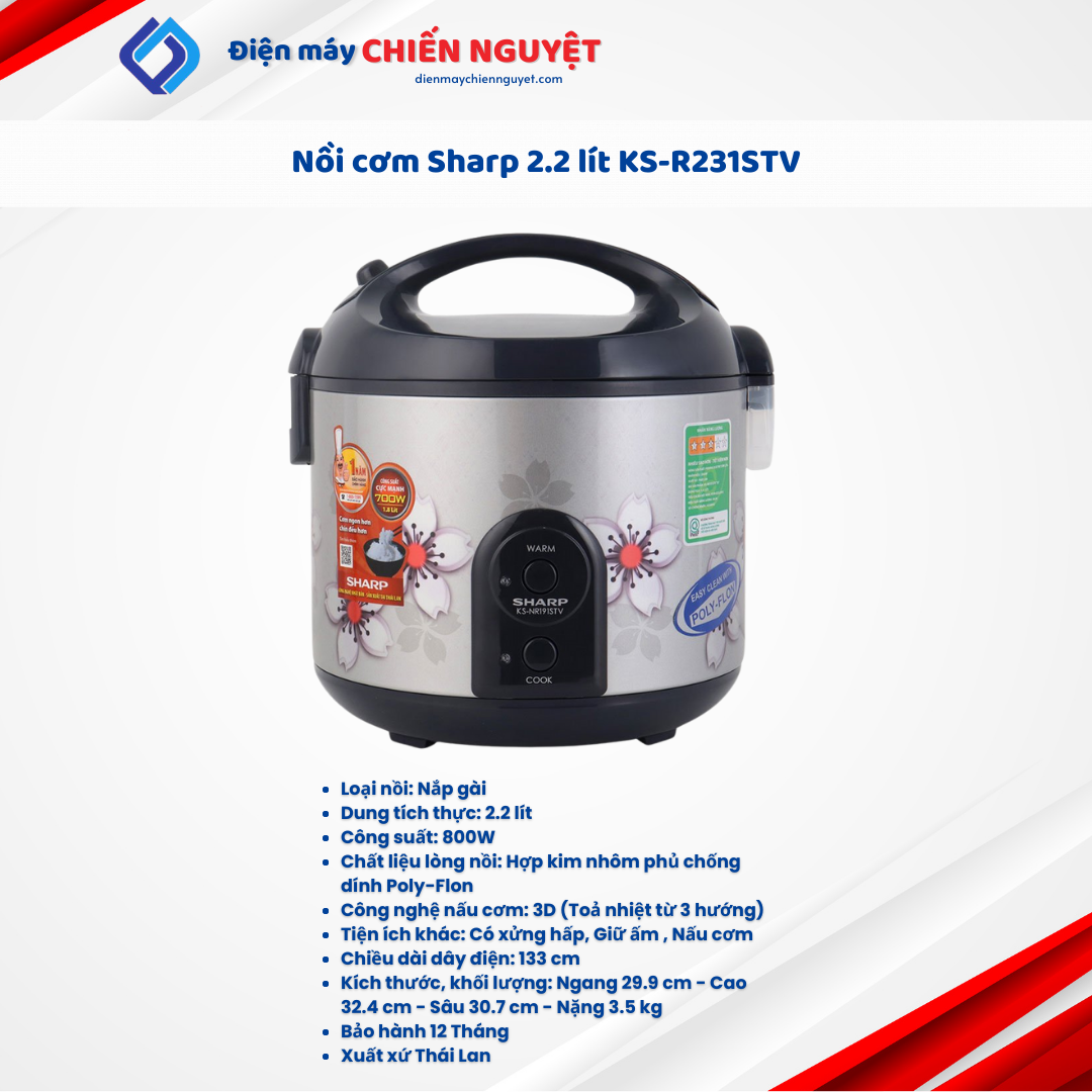 Nồi cơm Sharp 2.2 lít KS-R231STV thuộc thương hiệu Nhật Bản, sản xuất tại Thái Lan, dùng bền tốt, dung tích lớn, đáp ứng nhu cầu cơm hằng ngày tốt cho gia đình hay nhóm người có từ 6 thành viên trở lên.