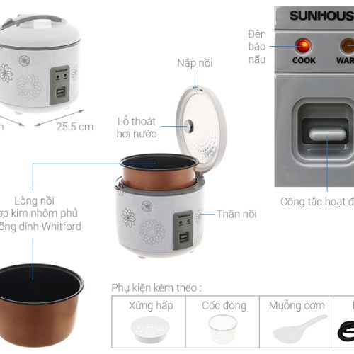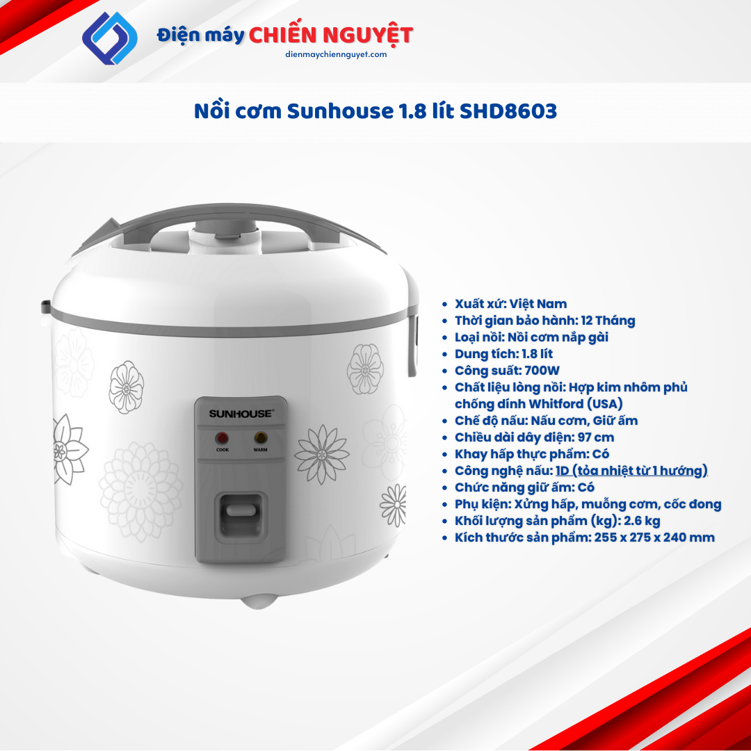 Nồi cơm Sunhouse 1.8 lít SHD8603 của thương hiệu Sunhouse uy tín Việt Nam, sản xuất tại Việt Nam, thiết kế đẹp, sử dụng đơn giản, thương hiệu Sunhouse quen thuộc với mọi gia đình.
