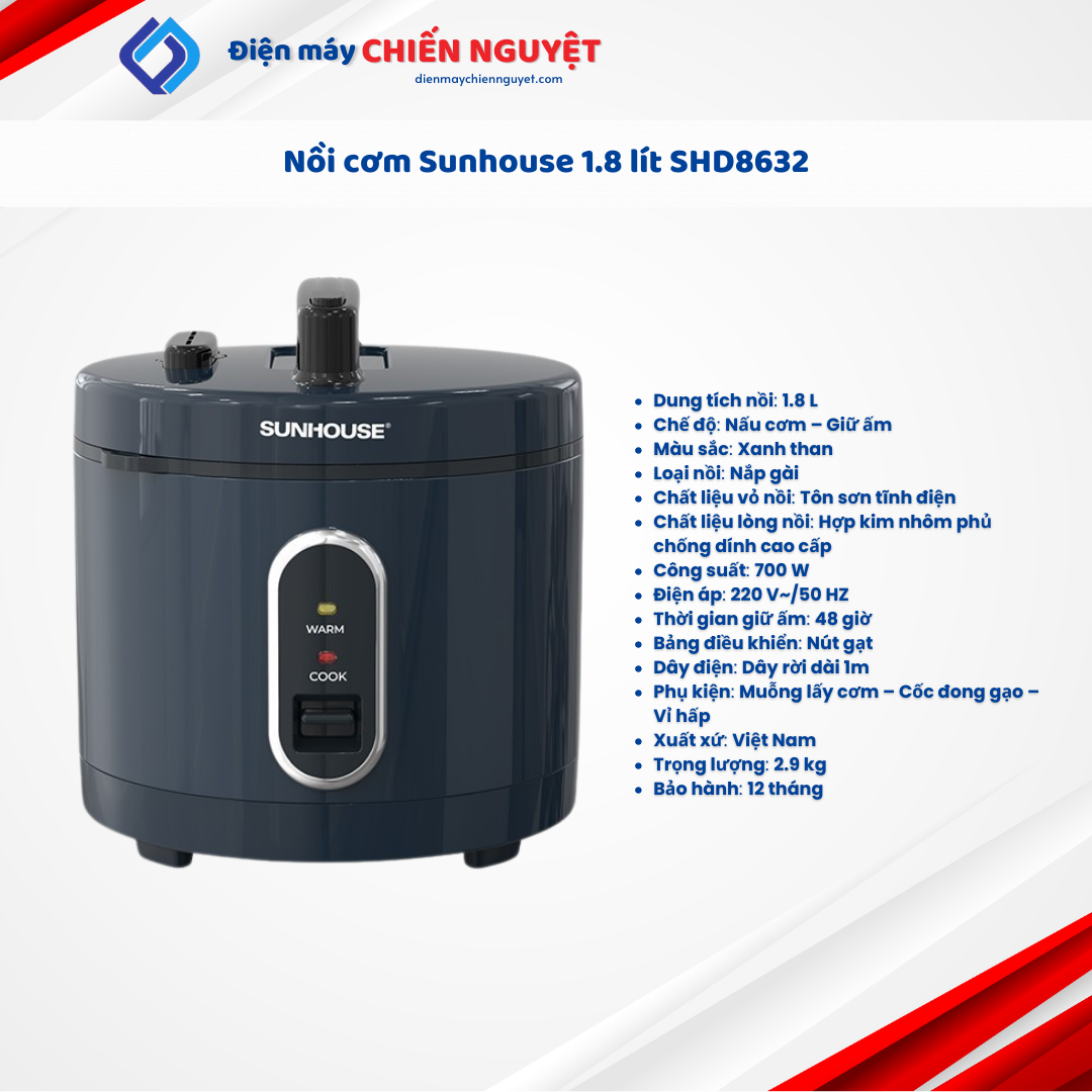 Nồi cơm Sunhouse 1.8 lít SHD8632