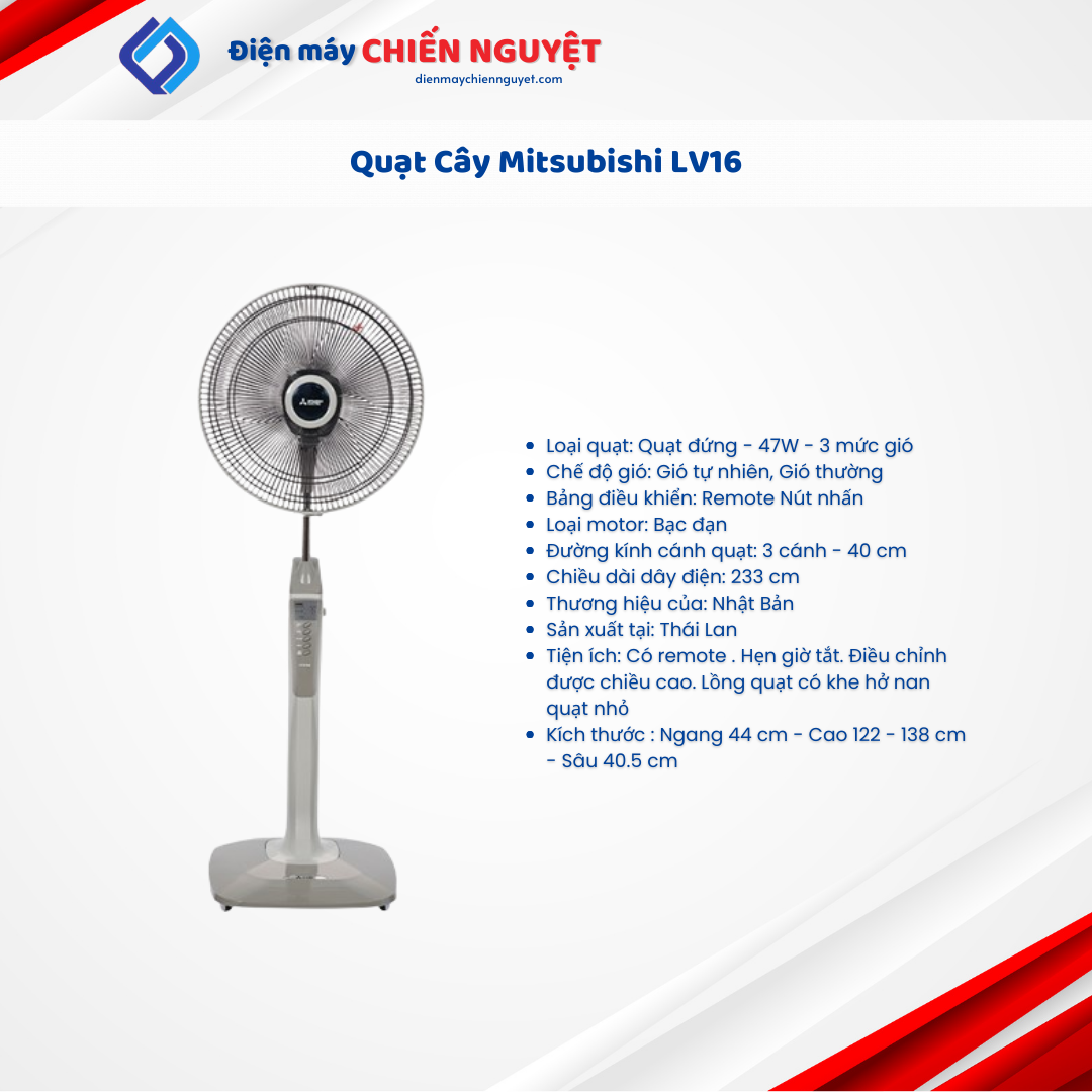 Quạt cây Mitsubishi LV16 xám nhạt thương hiệu Nhật Bản, sản xuất tại Thái Lan với thiết kế vững chắc, làm mát nhanh, là sản phẩm hoàn hảo giúp xua tan nắng nóng hiệu quả cho mọi gia đình.