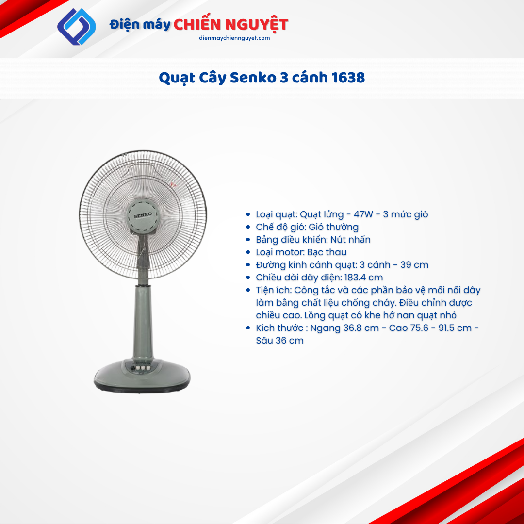 Quạt cây Senko L1638 thiết kế đẹp mắt, tùy chỉnh được chiều cao quạt, làm mát với 3 cánh quạt có công suất 47W, vận hành êm ái với động cơ bạc thau được làm từ chất liệu 100% dây đồng, bền bỉ, ít hao mòn.