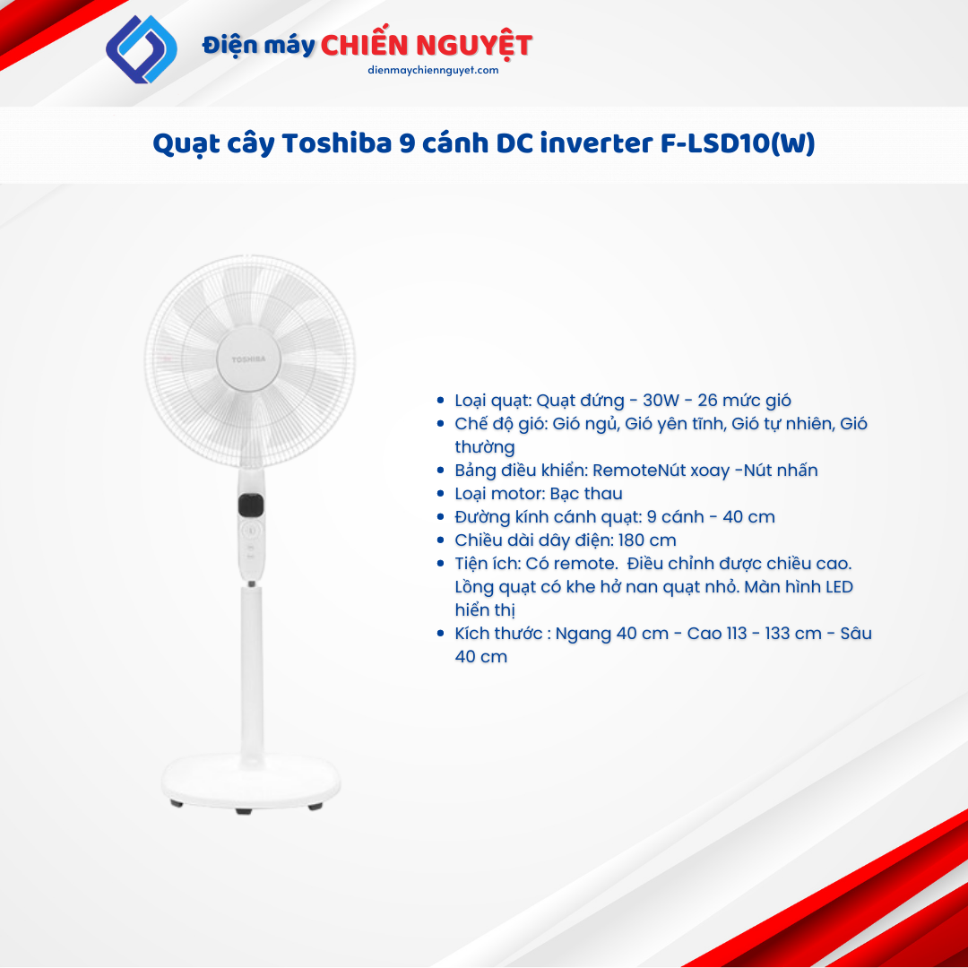 Quạt Toshiba F-LSD10(W) thuộc dòng quạt điện cơ có cánh quạt đường kính 40 cm, có tới 9 cánh kết hợp với công suất 30 W giúp làm mát không gian có diện tích rộng nhanh