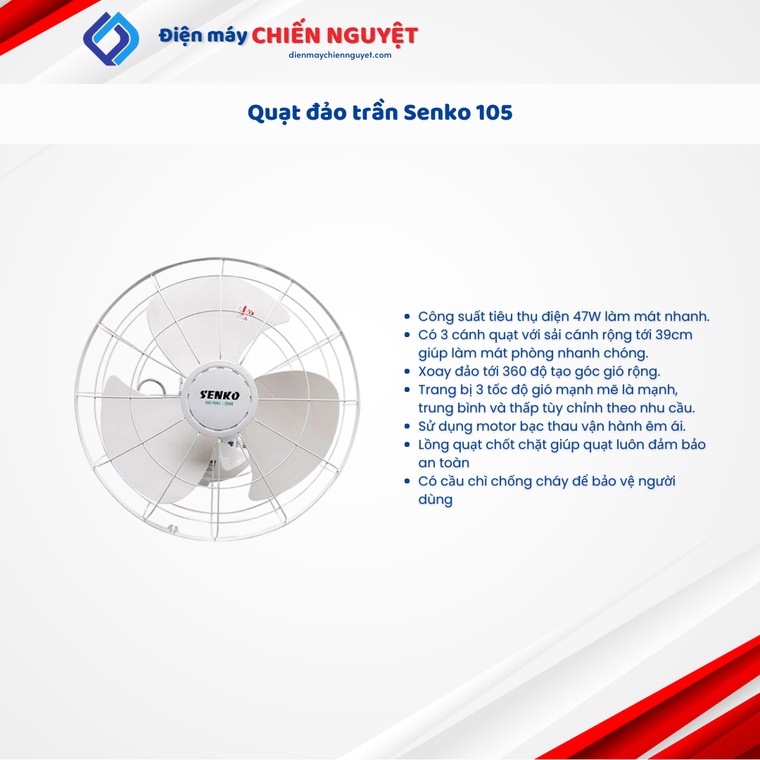 Với khả năng tạo nhiều tốc độ gió khác nhau, Quạt đảo trần Senko 105 giúp người sử dụng dễ dàng và chủ động hơn rất nhiều.