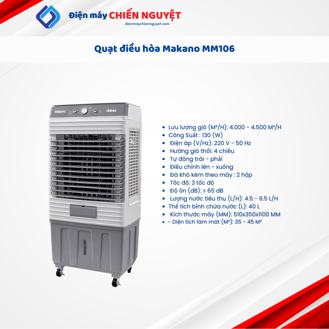 Quạt điều hòa Makano MM106 sở hữu hiệu suất làm mát vượt trội, giúp bạn nhanh chóng tận hưởng không khí mát mẻ trong những ngày hè nóng bức.