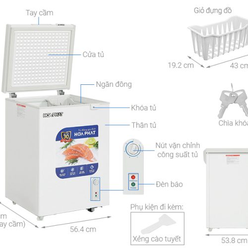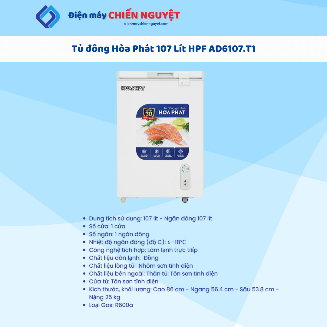 Tủ đông Hòa Phát 107 Lít HPF AD6107.T1 làm lạnh nhanh chóng, tiết kiệm điện năng với công nghệ làm lạnh trực tiếp, dàn lạnh bằng đồng và gas R600a, sử dụng và vệ sinh tiện lợi với các tiện ích giỏ đựng đồ, khóa cửa tủ, bánh xe và xẻng cạo tuyết