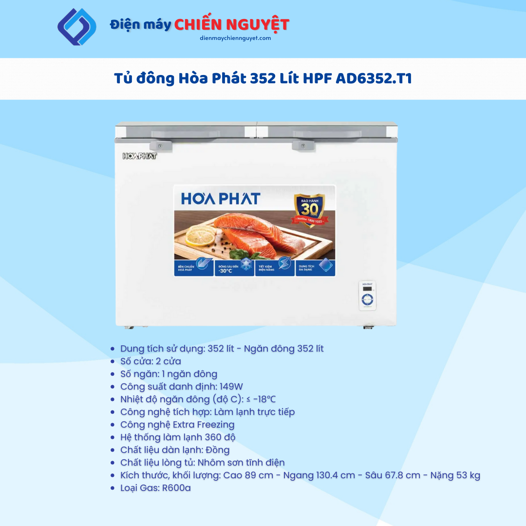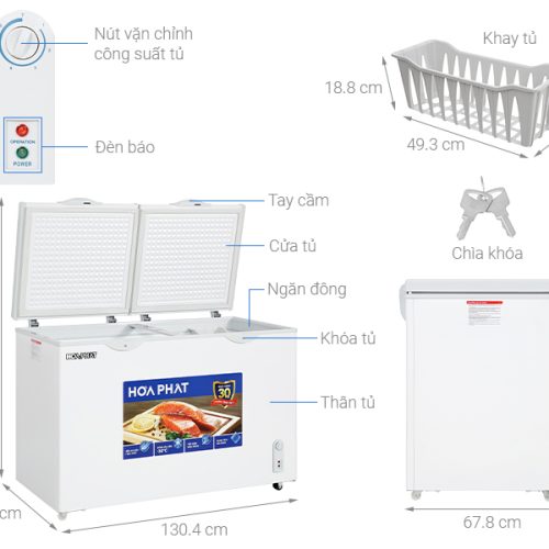 Tủ đông Hòa Phát 352 Lít HPF AD6352 có dung tích sử dụng lớn 352 lít, bảo quản thực phẩm tươi lâu với công nghệ làm lạnh trực tiếp, dàn lạnh bằng đồng bền bỉ, đi kèm đa dạng tiện ích: giỏ đựng đồ, khóa cửa tủ, bánh xe, xẻng cạo tuyết.