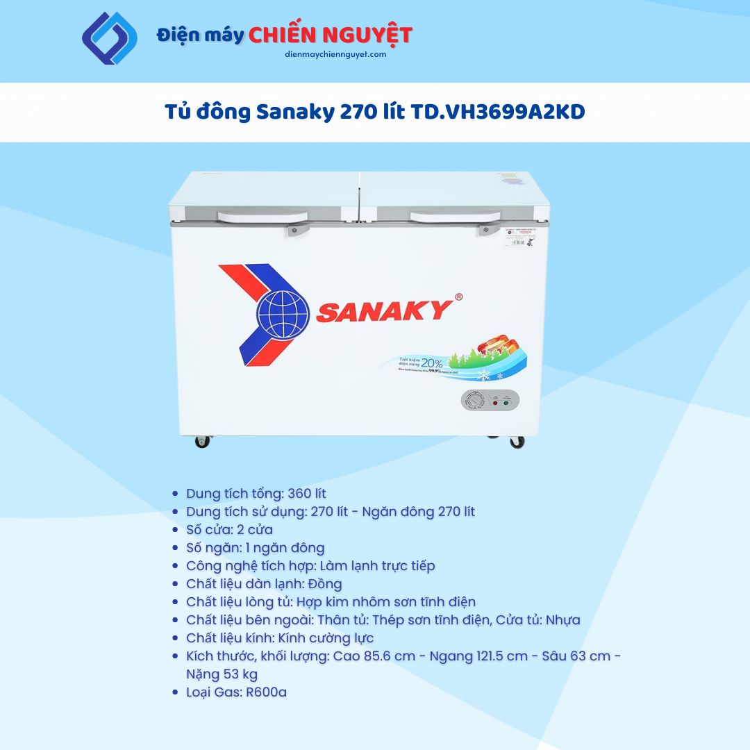 Nhìn chung, tủ đông Sanaky 270 lít TD.VH3699A2KD có đầy đủ các tiện ích hỗ trợ người dùng như giỏ đựng đồ, khóa cửa an toàn, lỗ thoát nước, bánh xe chịu lực xoay đa chiều. Sản phẩm đáp ứng nhu cầu lưu trữ thực phẩm hiệu quả nhờ dàn lạnh bằng đồng nguyên chất cùng Gas R600a bảo vệ môi trường. Với dung tích 270 lít, tủ đông Sanaky phù hợp cho nhu cầu sử dụng của các hộ kinh doanh, nhà hàng.