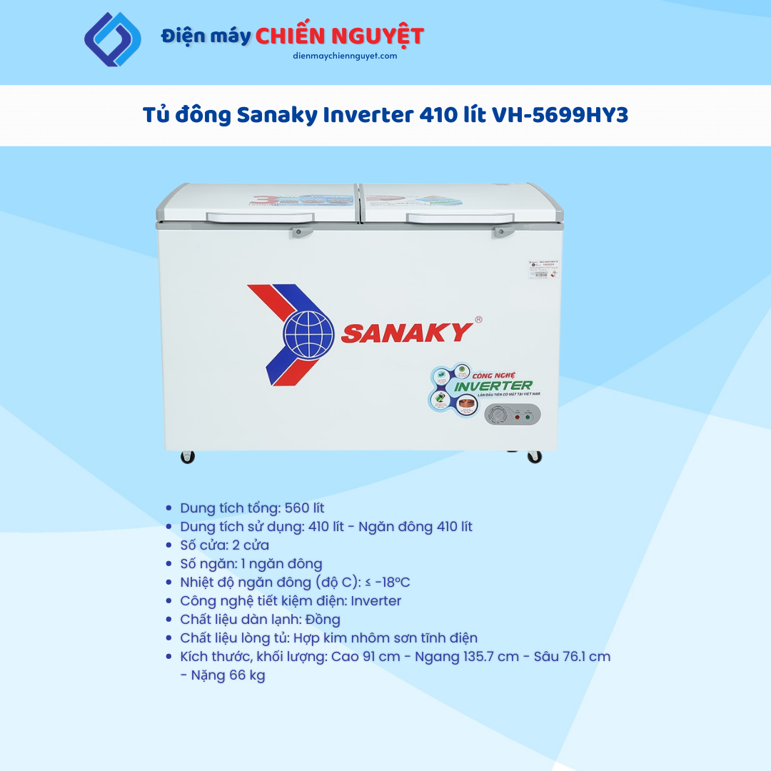 Tủ đông Sanaky Inverter 410 lít VH-5699HY3 thuộc một trong những loại tủ có dung tích khá lớn 410 lít đáp ứng cho nhu cầu bảo quản thực phẩm của gia đình từ 4 – 5 thành viên hay trong các quán ăn, cửa hàng. Trang bị các công nghệ hiện đại như làm lạnh trực tiếp, công nghệ Inverter giúp bảo quản thực phẩm tươi ngon lâu mà vẫn tiết kiệm điện.