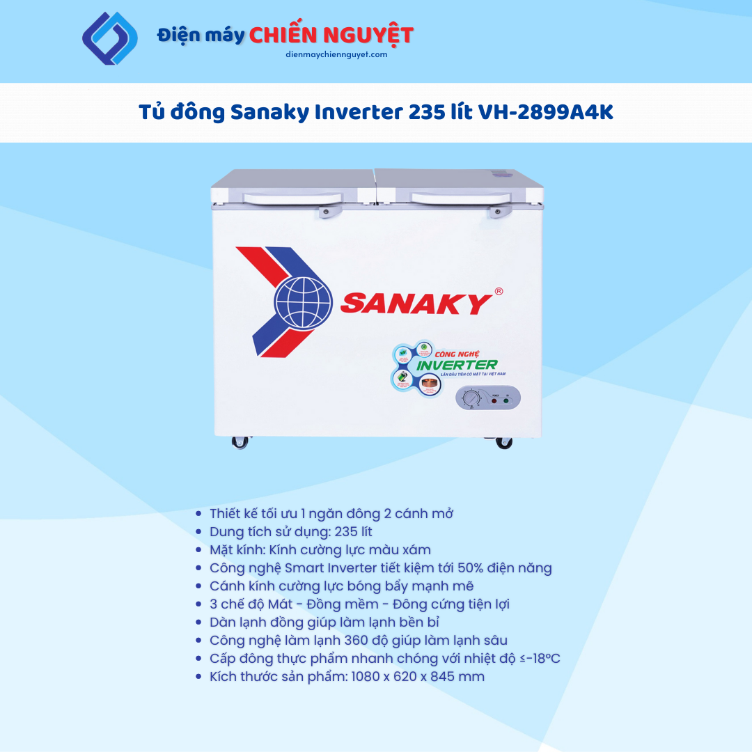 Tủ Đông Sanaky VH-2899A4K có dung tích 235 lít, thiết kế 1 ngăn đông cùng 2 cánh phủ kính cường lực là một trong những dòng tủ đông cỡ vừa sở hữu công nghệ làm lạnh hàng đầu Việt Nam. Sản phẩm này thích hợp sử dụng cho các cửa hàng bách hóa, nhà hàng, hộ gia đình từ 3-5 người,….