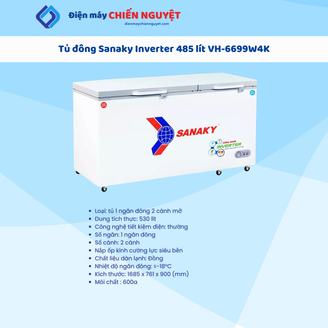 Tiết kiệm điện năng: Ưu điểm quan trọng nhất của tủ đông Sanaky VH-6699W4K Inverter là tiết kiệm điện, đặc biệt trong bối cảnh giá điện sinh hoạt tăng cao. Ở điều kiện thông thường, tủ đông inverter có thể giúp giảm tới 50% lượng điện năng tiêu thụ so với tủ đông thường.