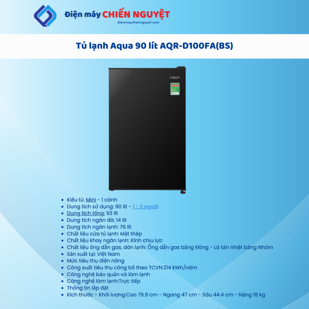 – Tủ lạnh Aqua 90 lít AQR-D100FA(BS) thuộc dòng tủ lạnh mini, có dung tích sử dụng 90 lít, đáp ứng nhu cầu sử dụng cho 1 – 2 người, phù hợp với những không gian vừa và nhỏ.