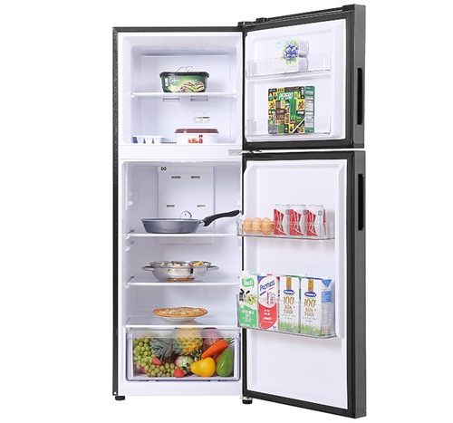 Tủ lạnh thuộc loại ngăn đá trên 2 cửa, sở hữu dáng thiết kế vuông vức hiện đại với gam màu xám đen sang trọng, điểm nhấn làm nổi không gian nội thất trong gian bếp của gia đình.