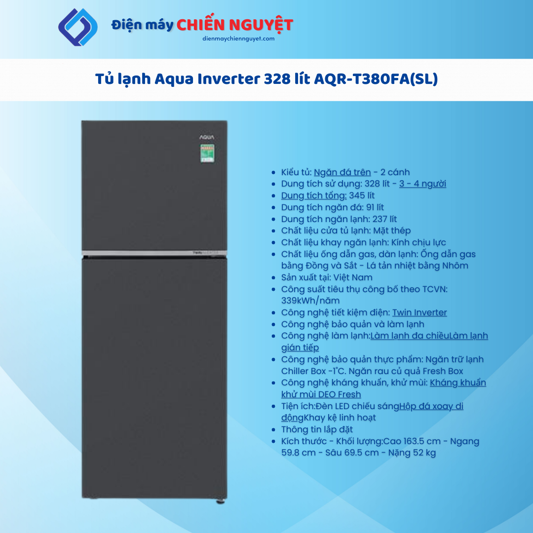 Mọi bữa ăn trong gia đình bạn luôn được thơm ngon hơn nhờ nguyên liệu tươi mát vì đã có chiếc tủ lạnh Aqua Inverter 328 lít AQR-T380FA(SL) trong gia đình. Độ tươi của rau củ cũng như thịt cá nhờ công nghệ làm lạnh đa chiều của tủ lạnh sẽ được lưu giữ lâu hơn. Công nghệ DEO Fresh loại bỏ mùi hôi và khử khuẩn sạch sẽ cùng với công nghệ Twin Inverter sẽ là “bộ đôi” trợ giúp người dùng có thực phẩm tươi nhưng vẫn tiết kiệm điện hiệu qu