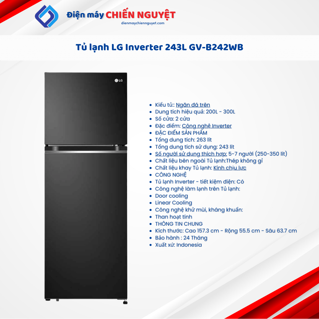 Tủ Lạnh LG Inverter 243 Lít GV-B242WB tích hợp những công nghệ hiện đại như làm lạnh Linear Cooling, làm lạnh từ cánh cửa Door Cooling, Smart Inverter và có mức giá tầm trung, thích hợp cho những gia đình có điều kiện kinh tế không quá dư dả. Dung tích thực 243 lít đáp ứng vừa đủ nhu cầu bảo quản thực phẩm của gia đình từ 2-3 người.