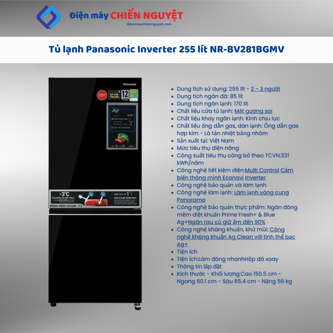 Nhìn chung, tủ lạnh Panasonic Inverter 255 lít NR-BV281BGMV là mẫu tủ lạnh ngăn đá dưới thích hợp cho gia đình từ 2 – 3 thành viên giúp bảo quản và phân loại thực phẩm tối ưu. Hơn nữa, tủ lạnh Panasonic này cũng có khả năng tiết kiệm điện hiệu quả, ngăn cấp đông mềm Prime Fresh+ & Blue Ag+,… giúp bảo quản thực phẩm tươi ngon, đảm bảo an toàn cho sức khỏe cả gia đình.
