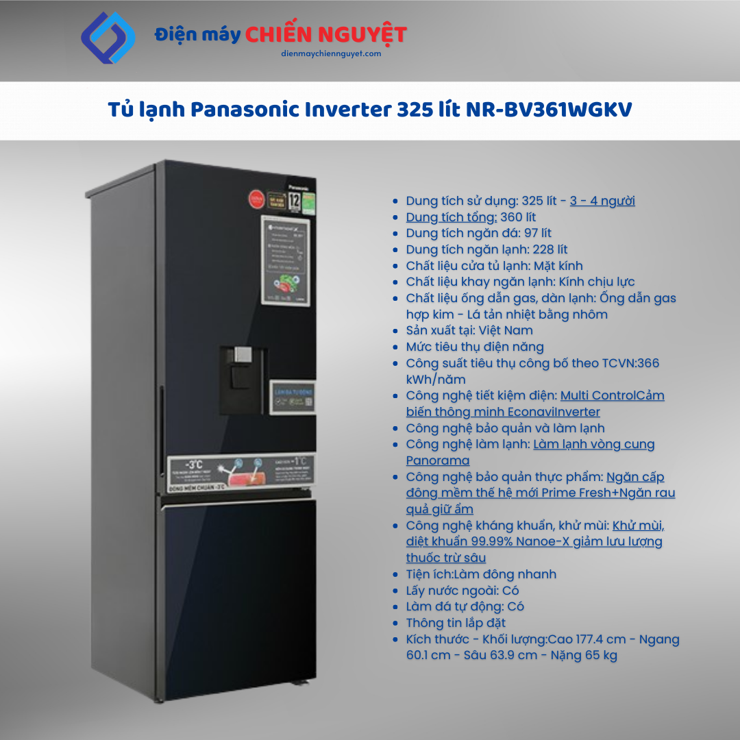 Tủ lạnh Panasonic Inverter 325 lít NR-BV361WGKV với thiết kế ngăn đá dưới hiện đại, dung tích 325 lít đáp ứng nhu cầu bảo quản thực phẩm của gia đình từ 3 – 4 thành viên, trang bị công nghệ Inverter kết hợp cảm biến Econavi giúp tiết kiệm điện năng, ngăn đông mềm Prime Fresh+, công nghệ nanoe-X vô hiệu hóa tới 99.99% vi khuẩn.