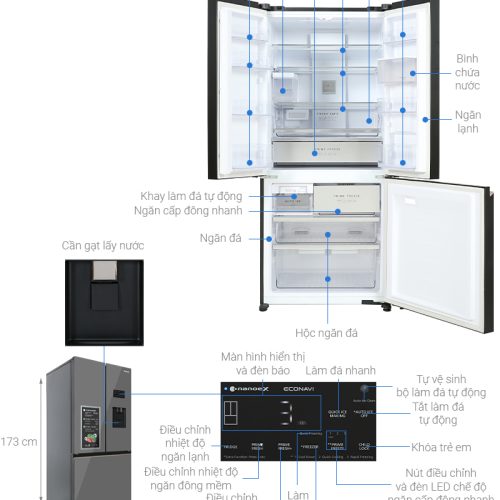 – Nhiều ngăn kệ được thiết kế trong tủ và bên trên cánh tủ giúp tăng không gian lưu trữ thực phẩm.