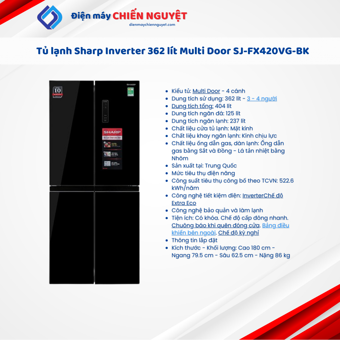 Kiểu dáng hiện đại Multi Door 4 cánh giúp lấy thực phẩm ra khỏi tủ dễ dàng, hạn chế thất thoát quá nhiều hơi lạnh. Công nghệ làm lạnh đa chiều, ngăn rau củ giữ ẩm chuyên dụng góp phần bảo quản thực phẩm tối ưu, hiệu quả hơn. Tủ lạnh Sharp Inverter 362 lít SJ-FX420VG-BK không gây hao phí quá nhiều điện năng nhờ có công nghệ Inverter kết hợp cùng chế độ Extra Eco giúp giảm nỗi lo tiền điện hàng tháng cho gia chủ.