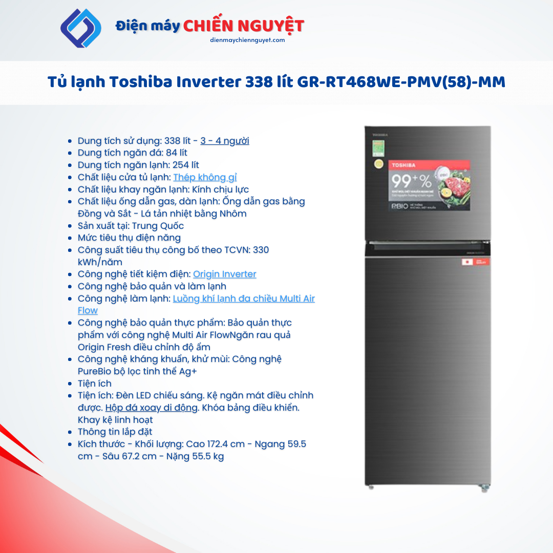 Nhìn chung, tủ lạnh Toshiba Inverter 338 lít GR-RT468WE-PMV(58)-MM đáp ứng nhu cầu bảo quản thực phẩm cho gia đình từ 3 – 4 người. Sản phẩm có khả năng tiết kiệm điện, an tâm và phù hợp với nhiều gia đình hiện nay.