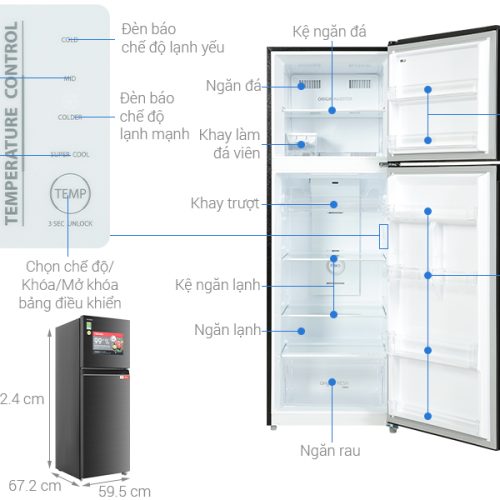 – Ngăn đá được thiết kế dung tích 84 lít, gồm có 2 ngăn riêng biệt, 1 hộp làm đá và 2 khay chứa nằm bên cánh cửa tủ.